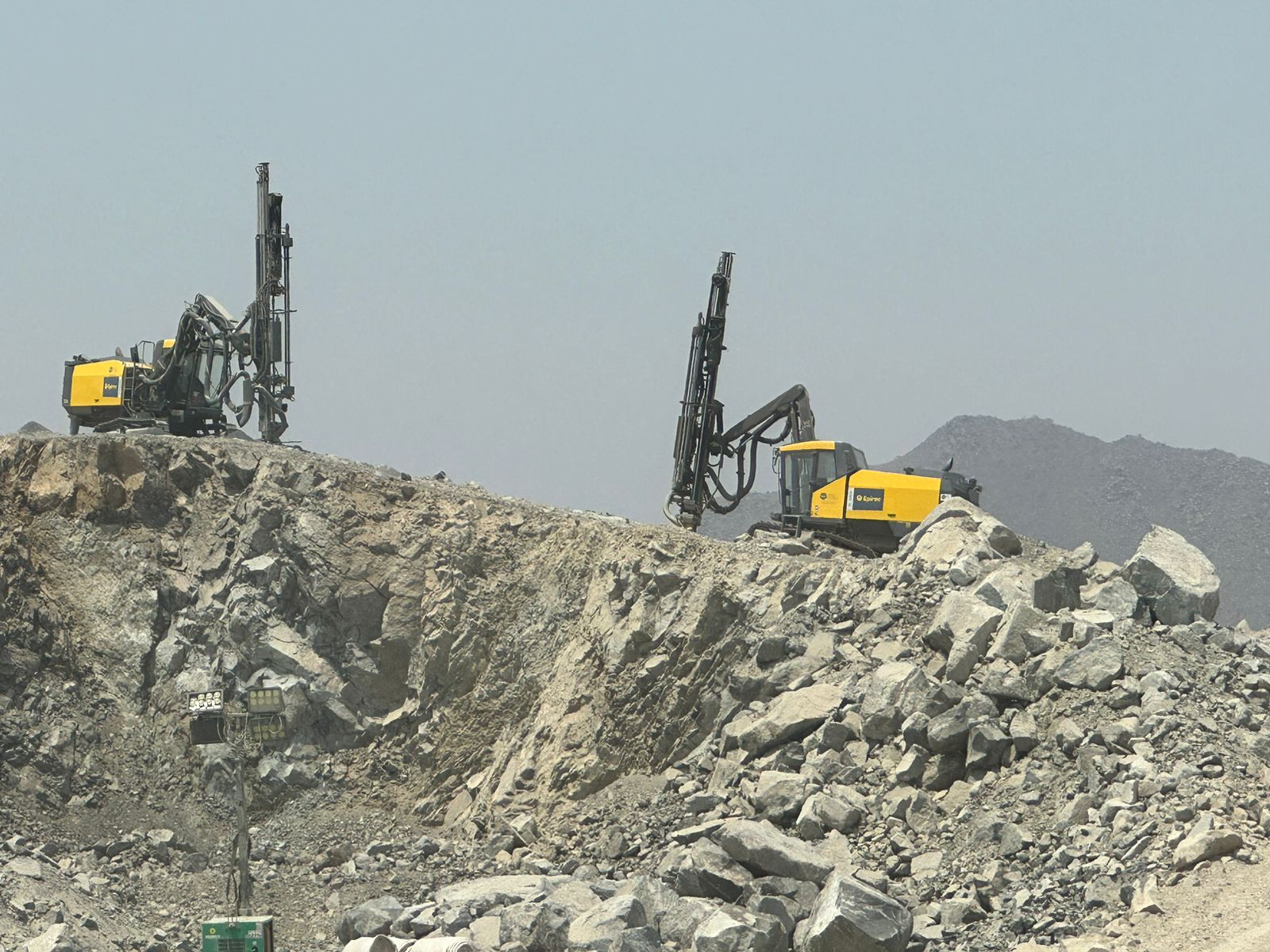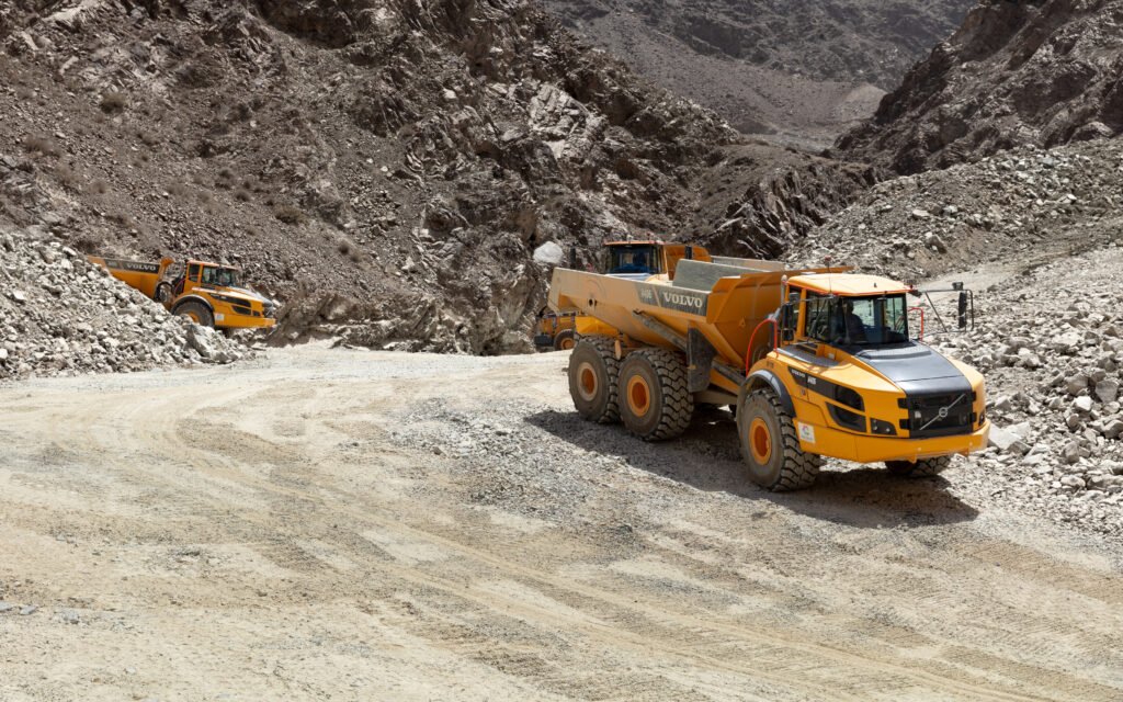 This image shows heavy construction machinery handling large stones at an industrial site surrounded by mountains.